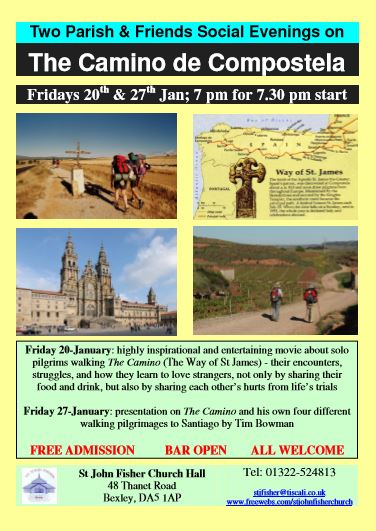 Fri 20 Jan: Entertaining movie about pilgrims walking the Camino (The way of St James) – their encounters, struggles and how they learn to love strangers and share each other’s hurts. 2) Fri 27 Jan: Presentation on the Camino by Tim Bowman. For both events: all welcome, admission free, arrivals in Hall from 7pm for 7.30 pm start.
