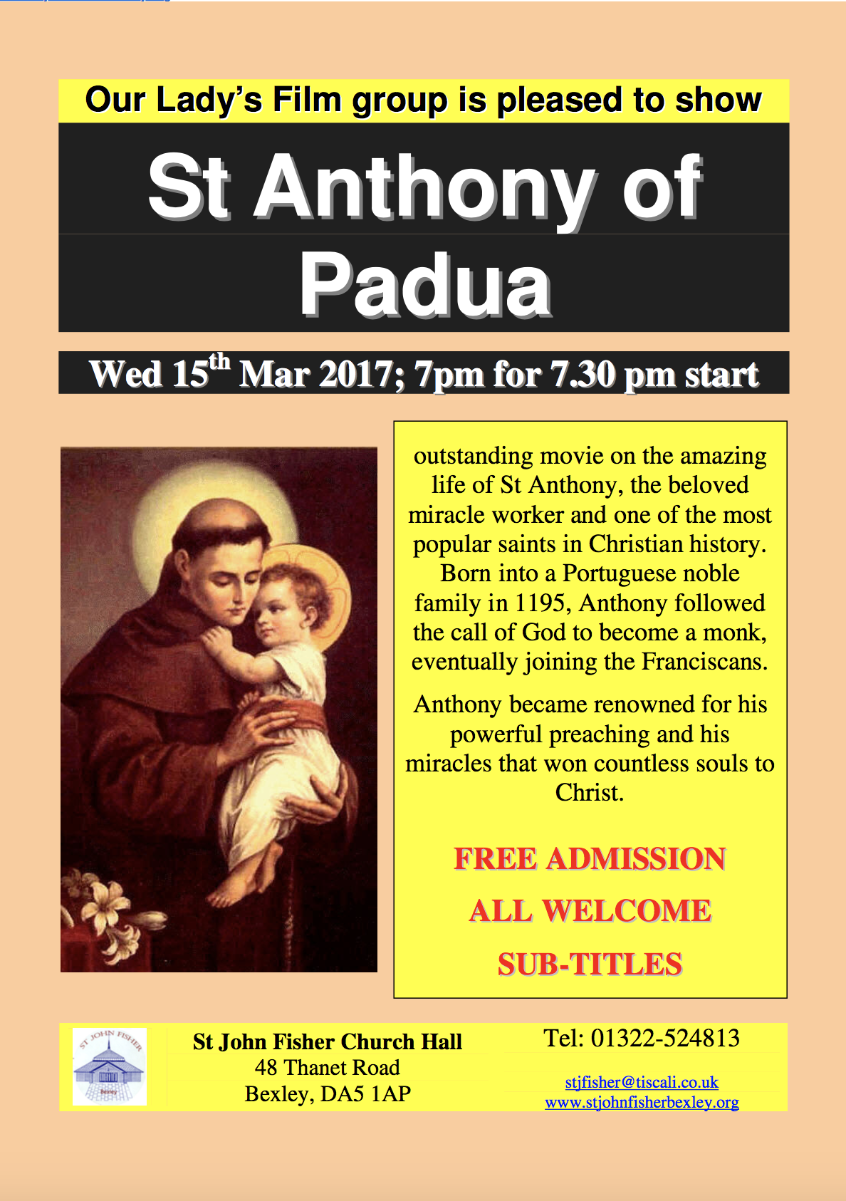 Wednesday 15th March: Outstanding movie on the amazing life of St Anthony of Padua, one of the most popular saints in Christian history. Anthony became renowned for his powerful preaching and miracles that won countless souls to Christ. Bar open and charity stall. All welcome, 7pm for 7.30pm start.