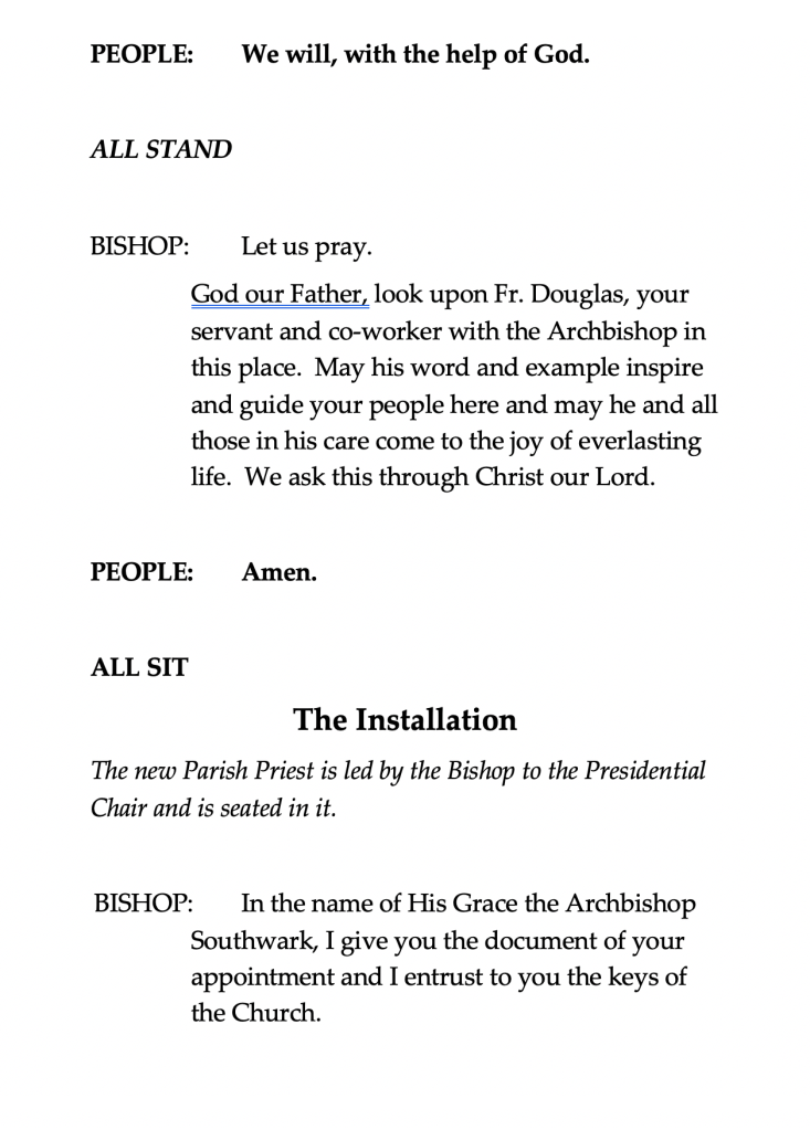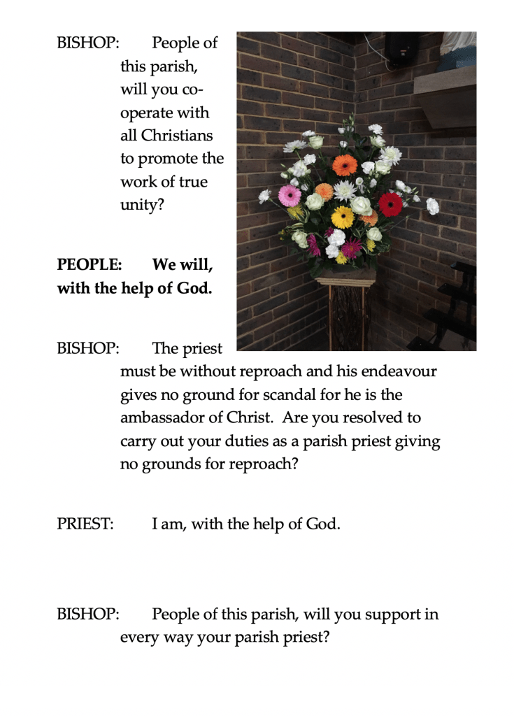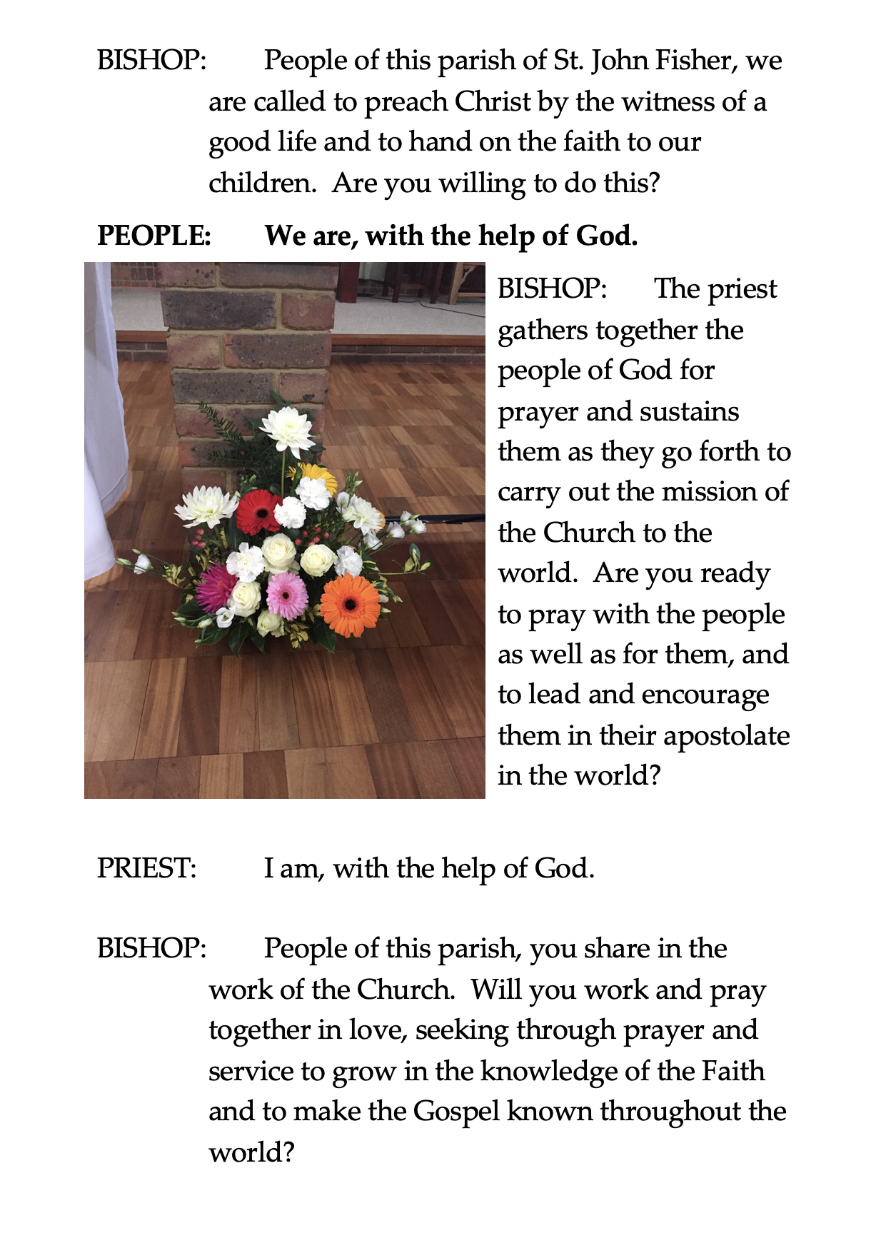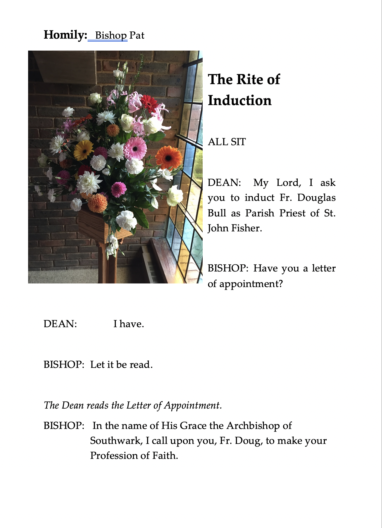 Induction Service Click below to hear the full Induction Service https://stjohnfisherbexley.org/wp-content/uploads/2018/10/induction.mp3 Fr Doug with Bishop Pat