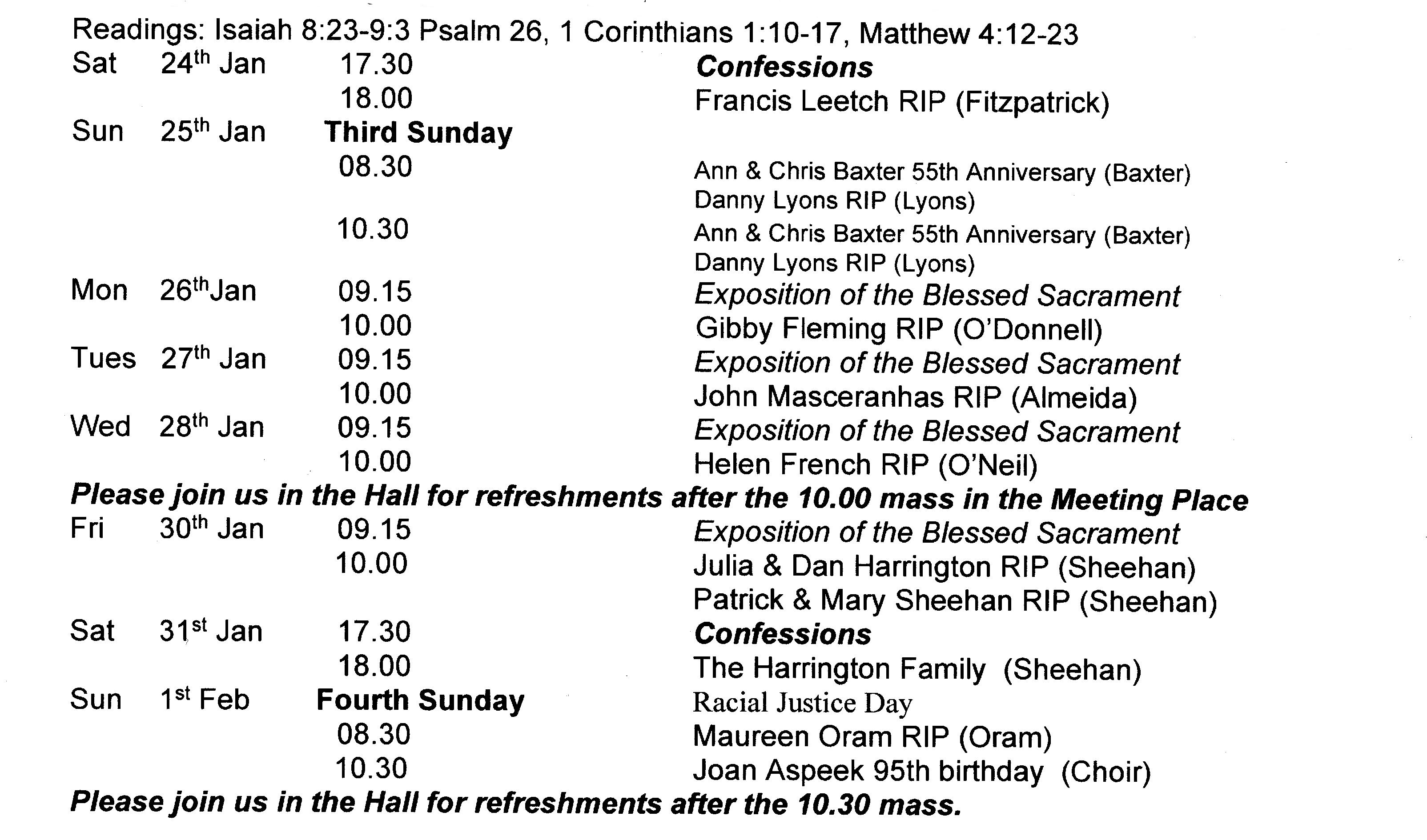 Please join us in the Hall for refreshments after the 10.00 mass in the Meeting Place